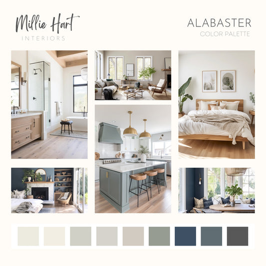 Alabaster Sherwin Williams Paint Palette, Modern Neutral Interior Paint Colors for Home, Alabaster Compliments, Warm Whites, Agreeable Gray
