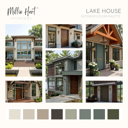 Lake House Exterior Sherwin Williams Paint Palette, Cabin Exterior Paint Colors, Modern Mountain Exterior Scheme