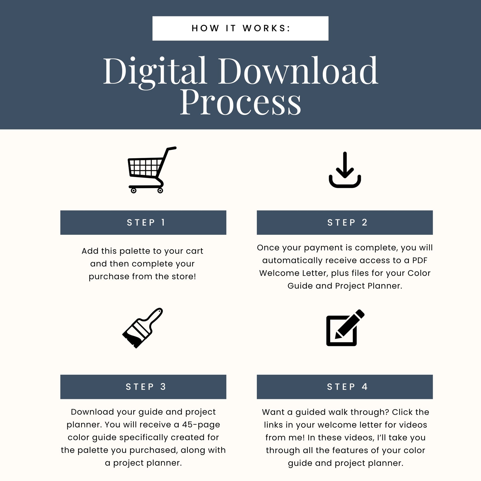 Upon purchase, you will receive an email with a link to download your professionally created color guide immediately. Since your color guide arrives digitally, you can get started on your project right away.