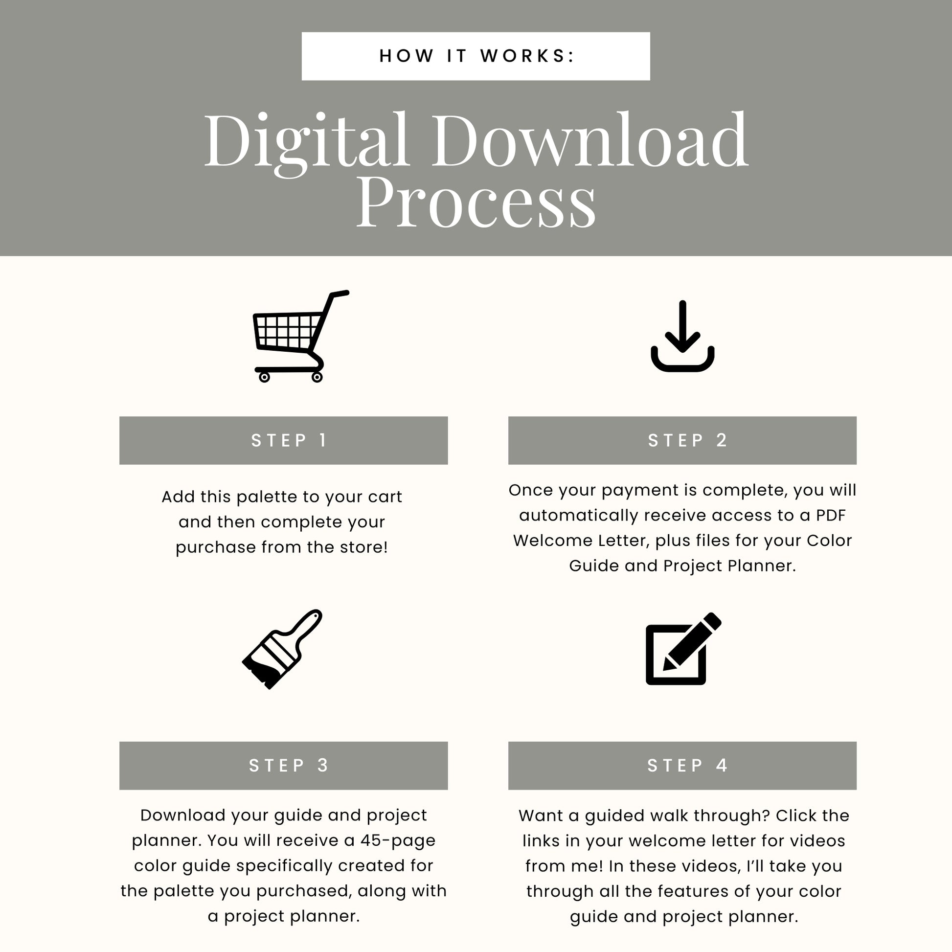 Upon purchase, you will receive a beautiful digital color guide with: