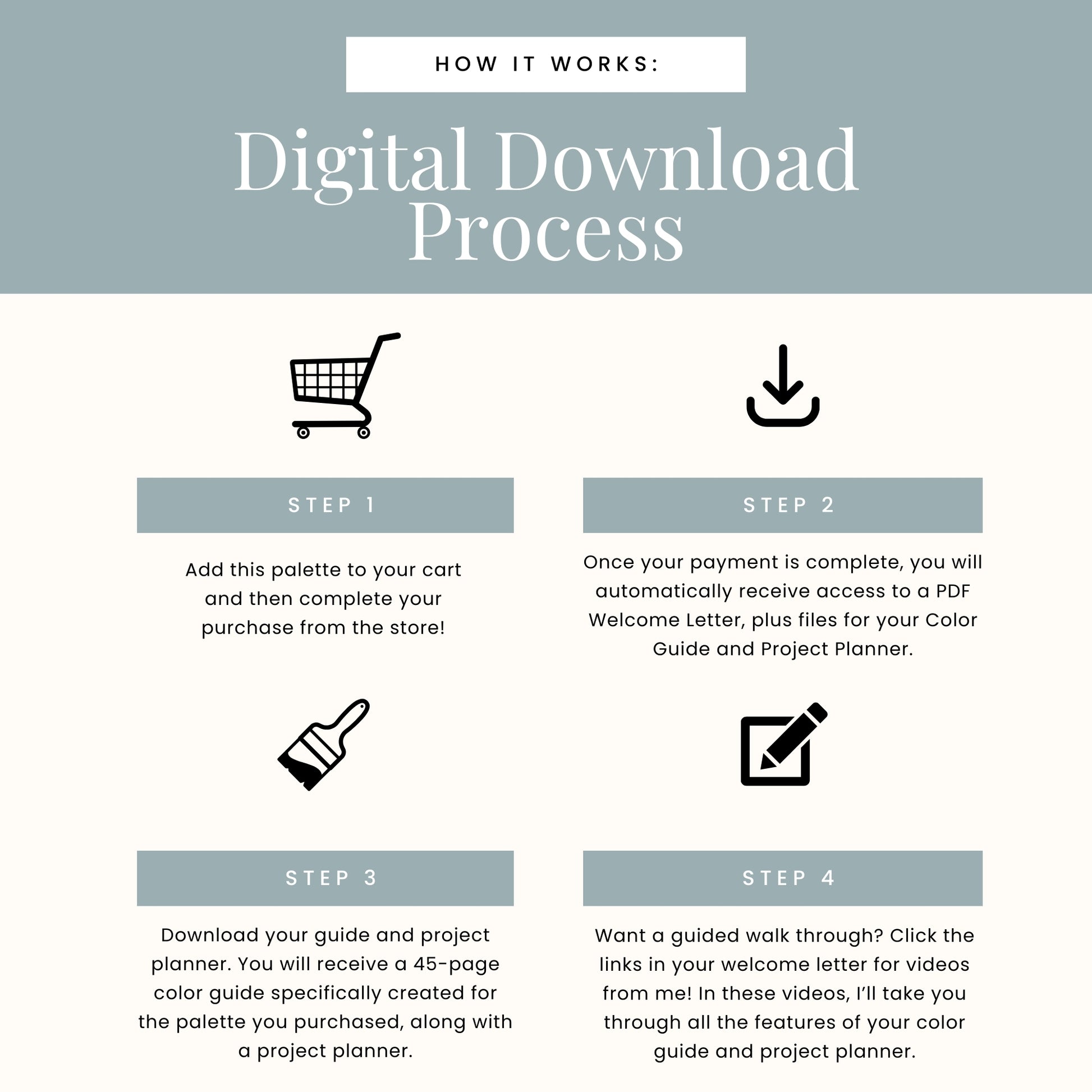 Upon purchase, you will receive an email with a link to download your professionally created color guide immediately. Since your color guide arrives digitally, you can get started on your project right away.