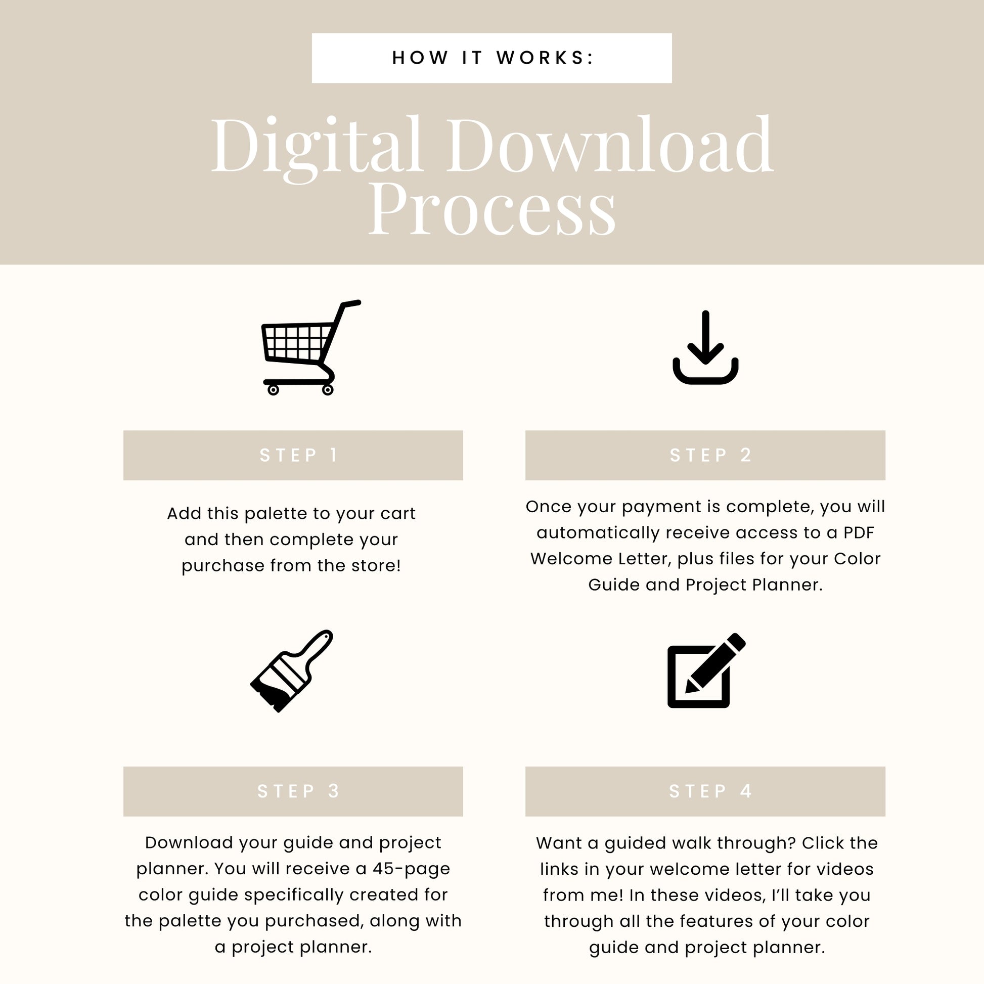 Upon purchase, you will receive an email with a link to download your professionally created color guide immediately. Since your color guide arrives digitally, you can get started on your project right away.