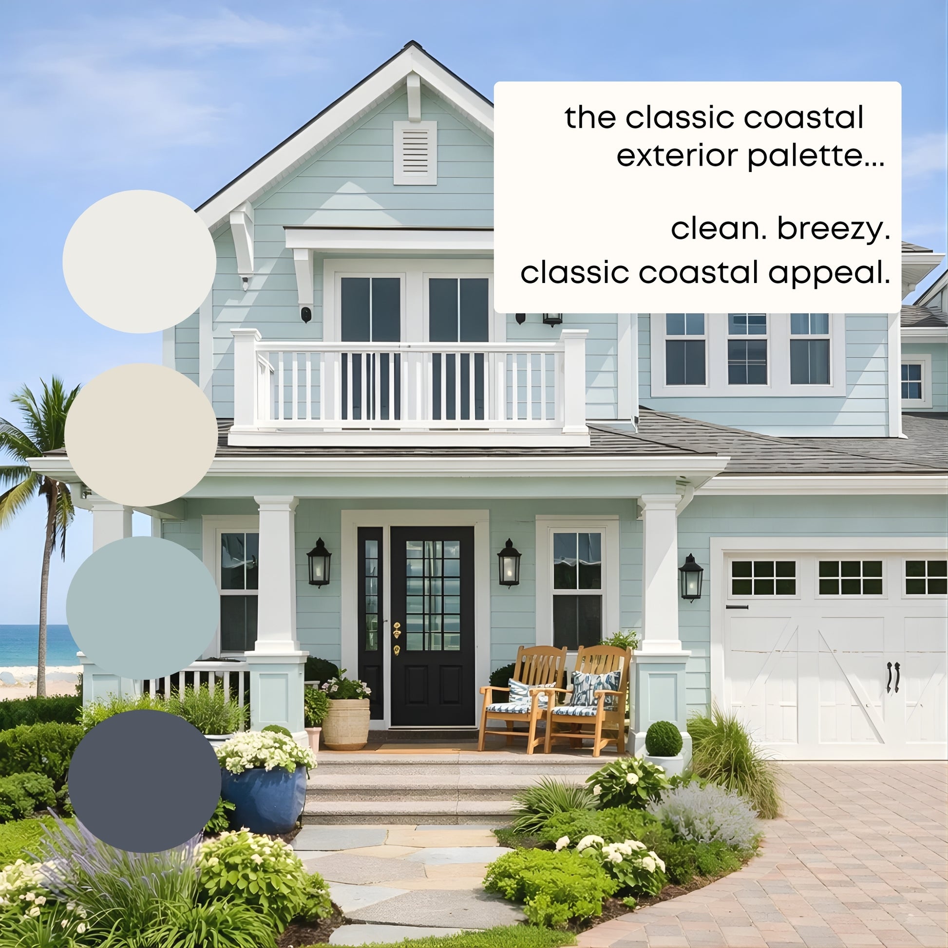 Classic Coastal Exterior Sherwin Williams Paint Palette, Beach House Exterior Paint Colors, Coastal Exterior Scheme, Classic Palette