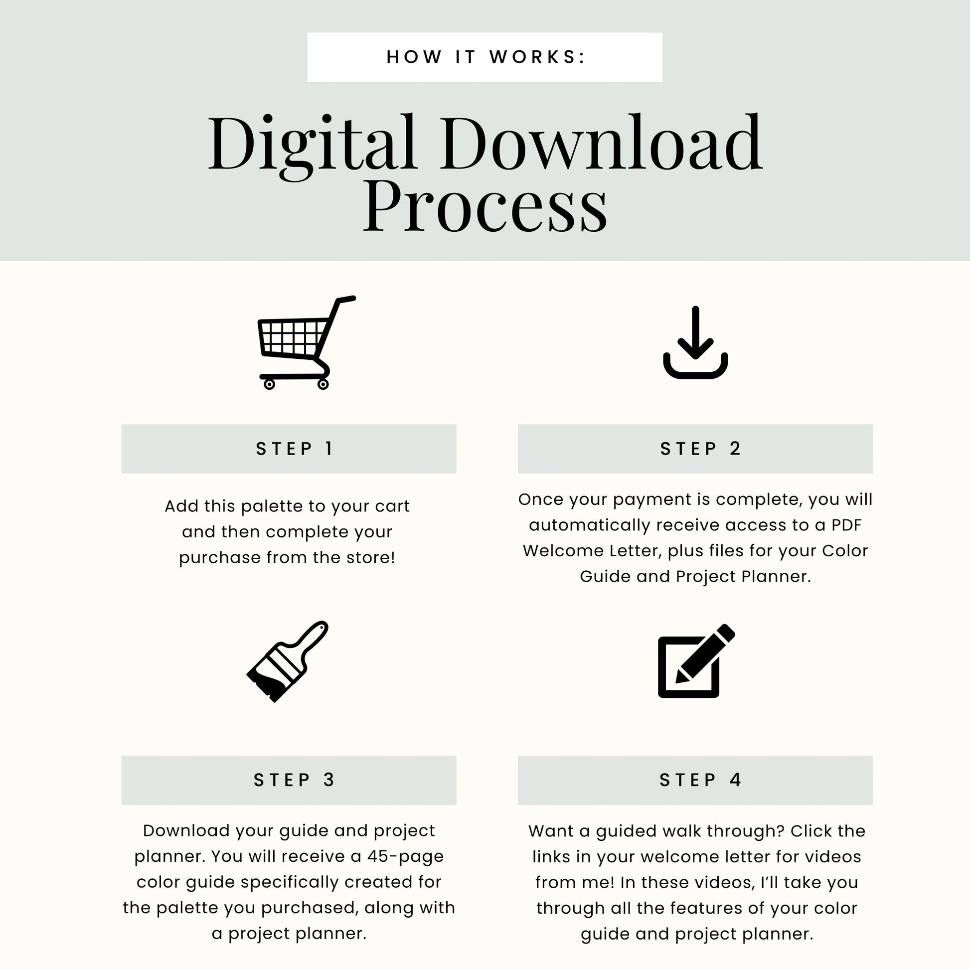 Upon purchase, you will receive an email with a link to download your professionally created color guide immediately. Since your color guide arrives digitally, you can get started on your project right away.