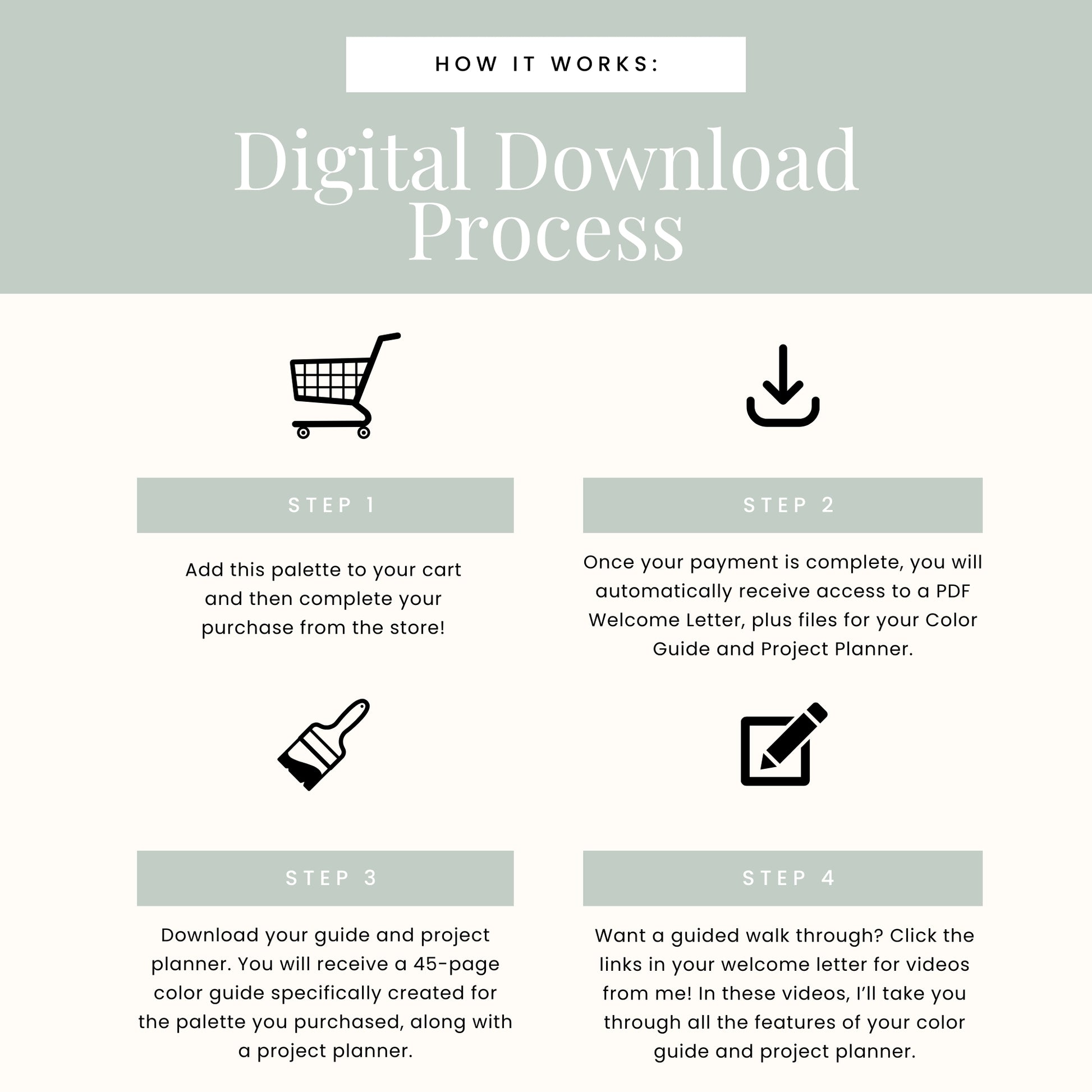 Upon purchase, you will receive an email with a link to download your professionally created color guide immediately. Since your color guide arrives digitally, you can get started on your project right away.