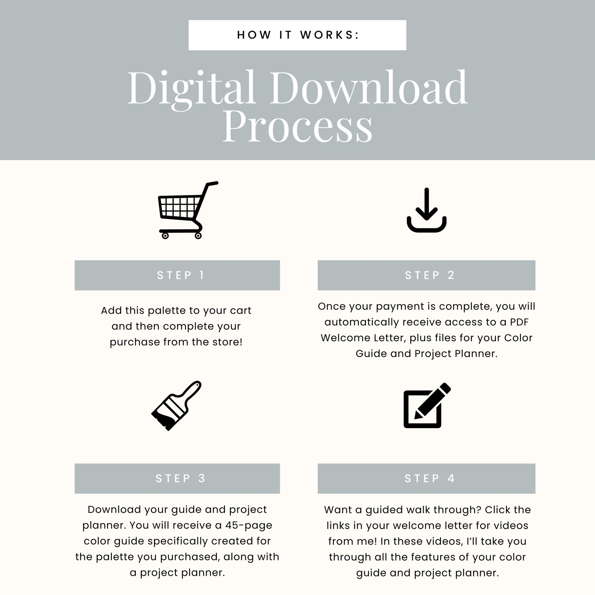 Upon purchase, you will receive an email with a link to download your professionally created color guide immediately. Since your color guide arrives digitally, you can get started on your project right away.