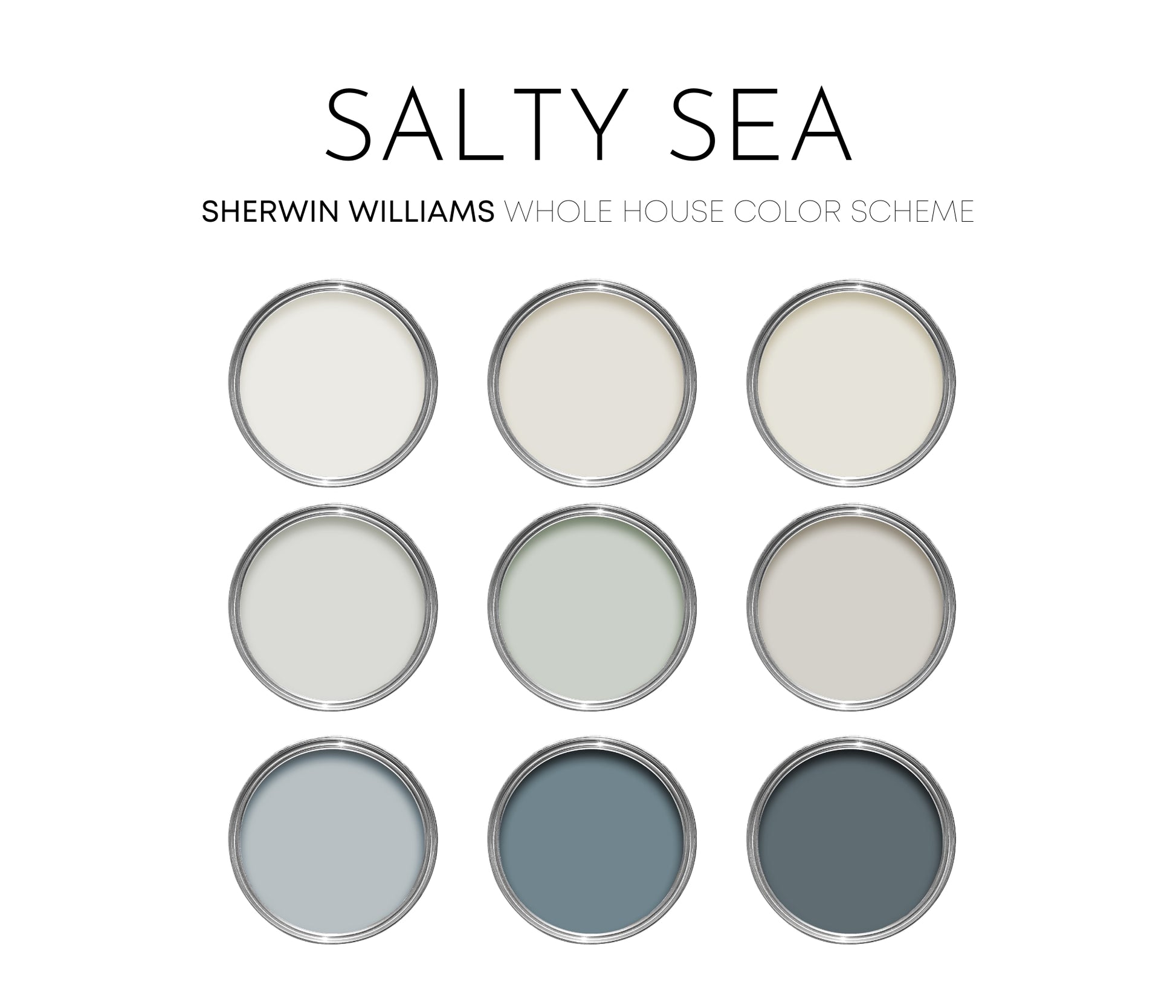 This Salty Sea paint palette was professionally designed with Sherwin Williams paint colors for the perfect coastal or beach house color scheme. It features many popular and best-selling colors.
