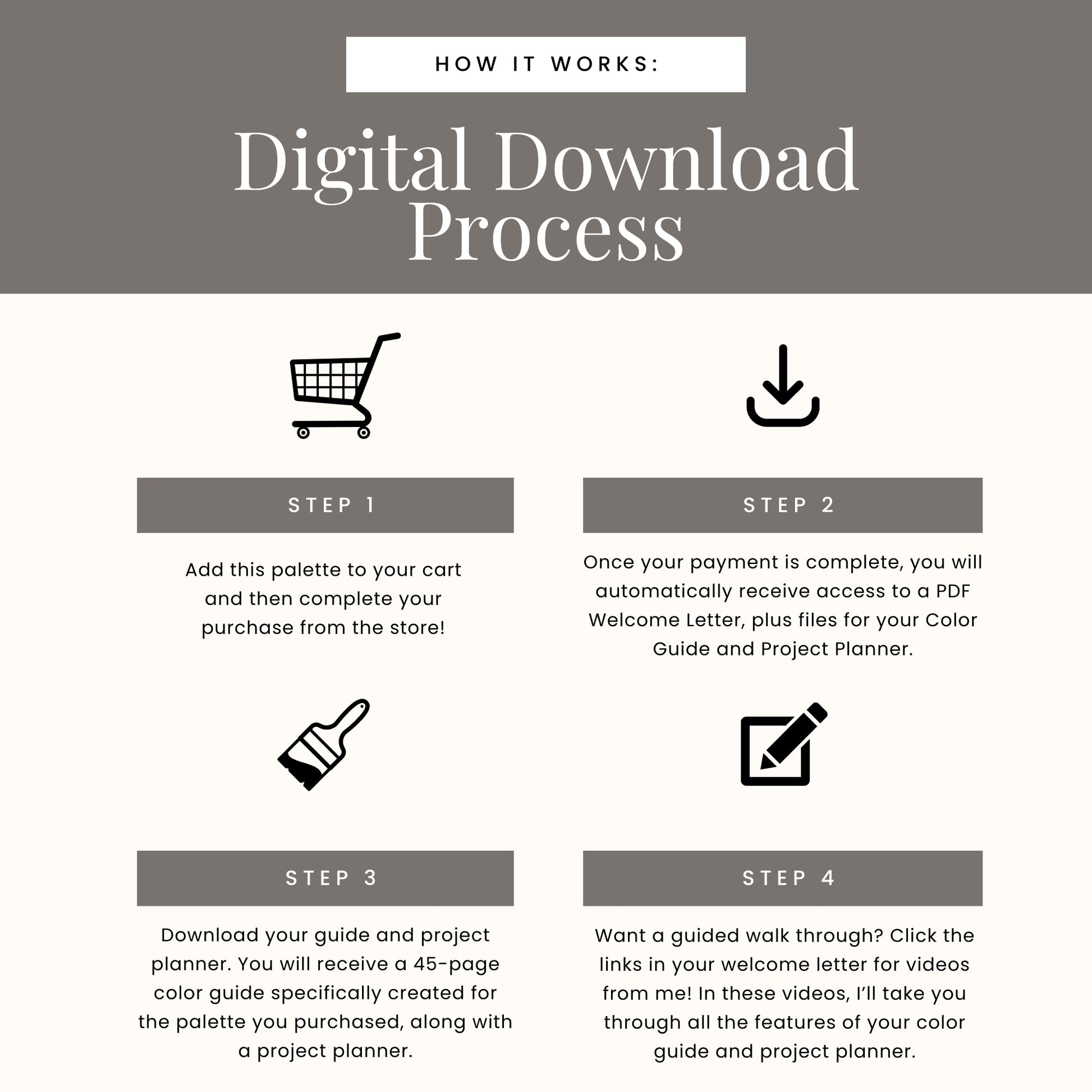 Upon purchase, you will receive an email with a link to download your professionally created color guide immediately. Since your color guide arrives digitally, you can get started on your project right away.